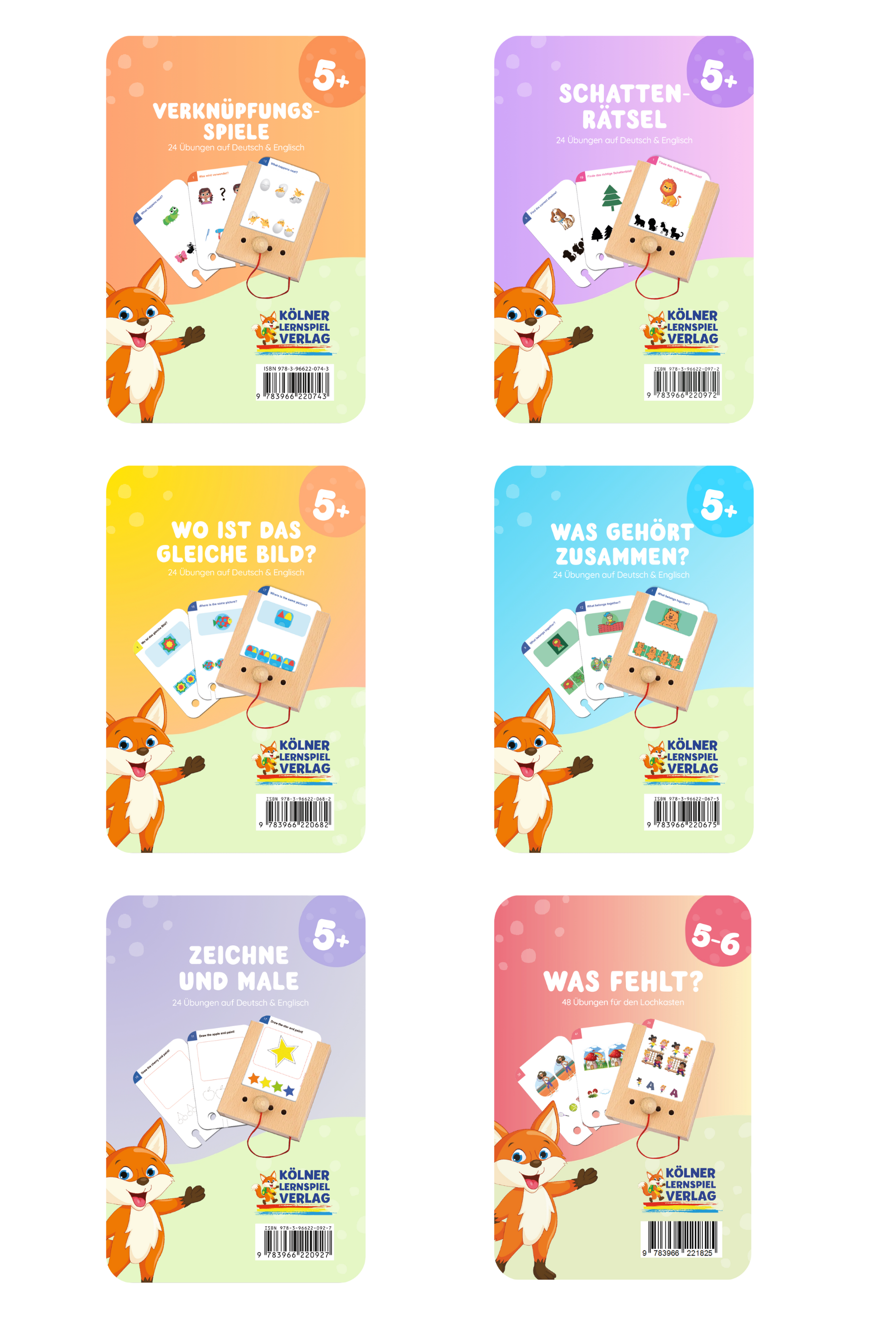 Die 6 verschiedenen Kartensätze ab 5 Jahren ohne den Lochkasten