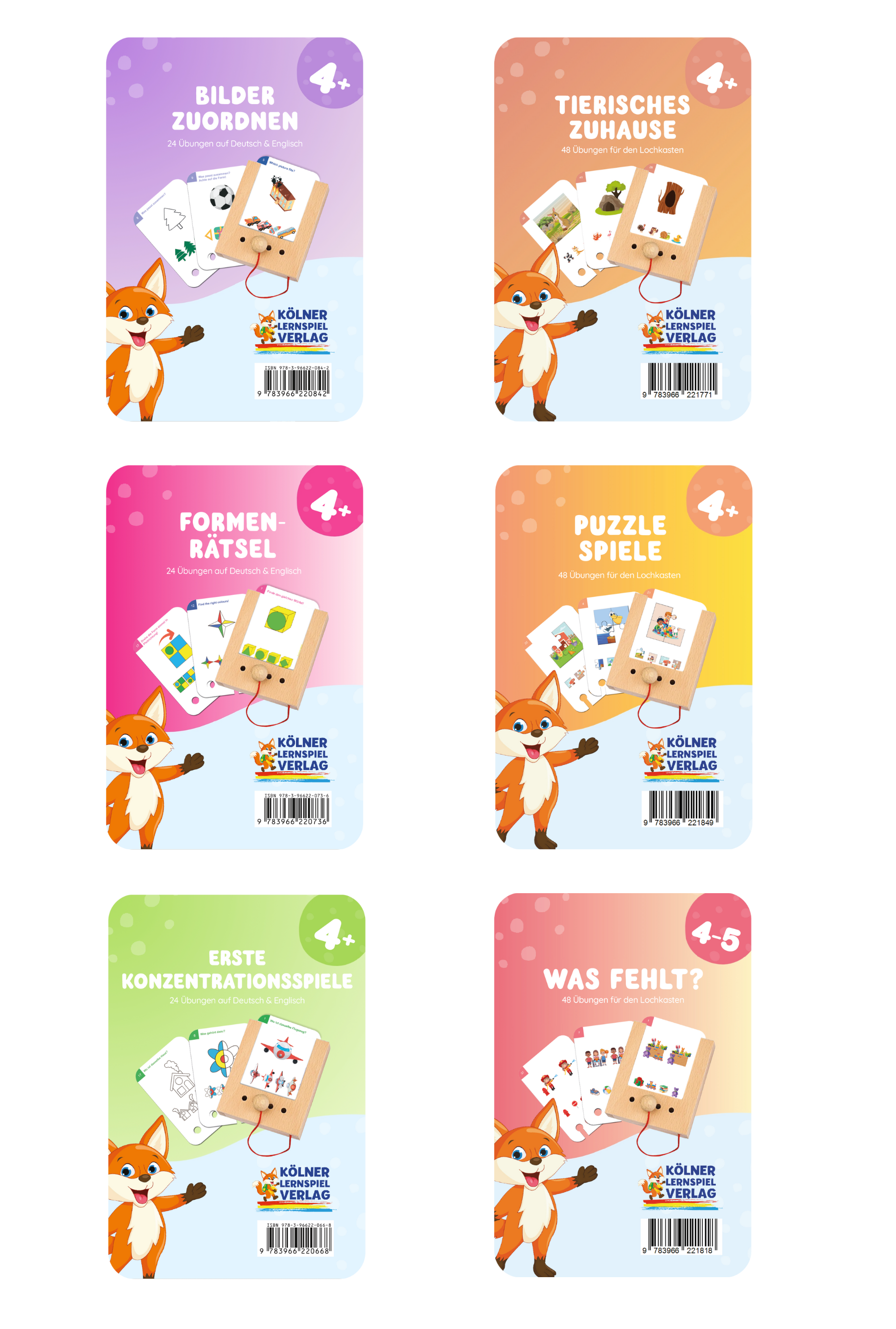 Die verschiedenen Kartensätze ab 4 Jahren ohne den Lochkasten