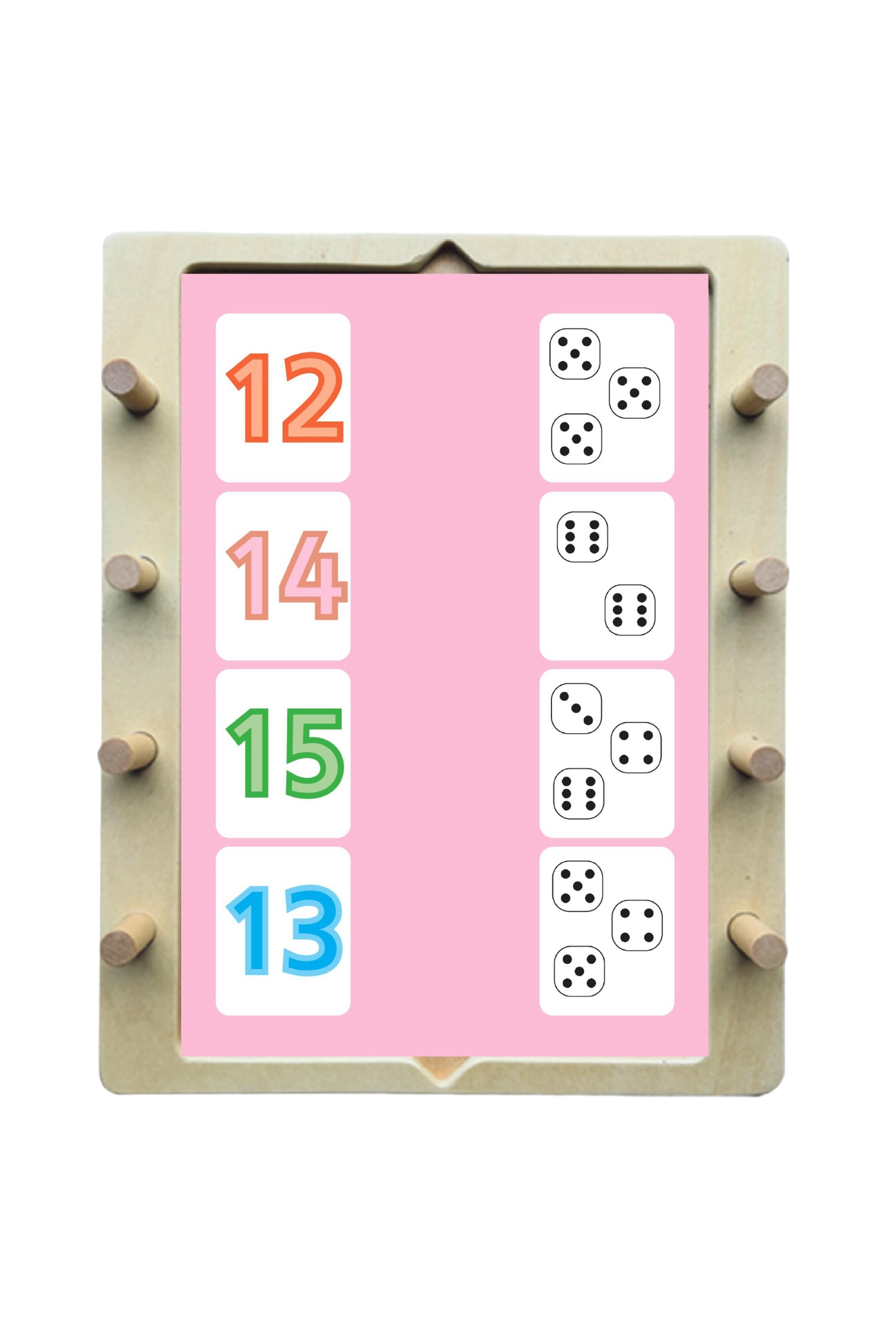 dass es auf das Alter und die Interessen des Kindes abgestimmt werden kann. Auf der Rückseite befindet sich eine praktische Selbstkontrolle. Nachdem das Kind die Aufgabe gelöst hat, kann es die Karte herausziehen, umdrehen und wieder in den Holzrahmen schieben, um zu überprüfen, ob die Gummiringerl richtig gespannt wurden.